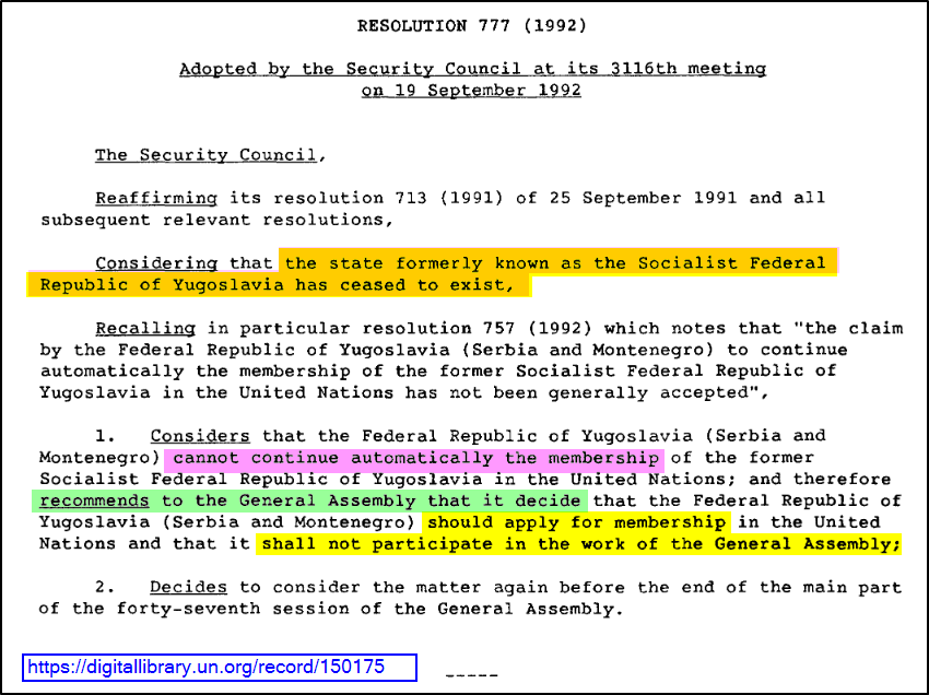 Missing: there were no documents comparable to those filed in the proper procedure followed 4 months later in the case of an identical situation: a letter from the UN member, the Socialist Federal Republic of Yugoslavia dated 27 April 1992, annexing a joint declaration by itself, Serbia & Montenegro that Serbia and Montenegro were continuing its UN membership, receipted, stamped, numbered and circulated to all United Nations members.