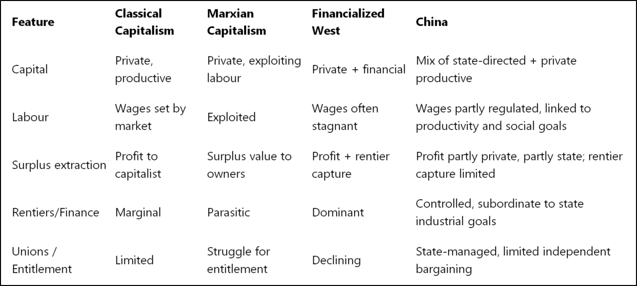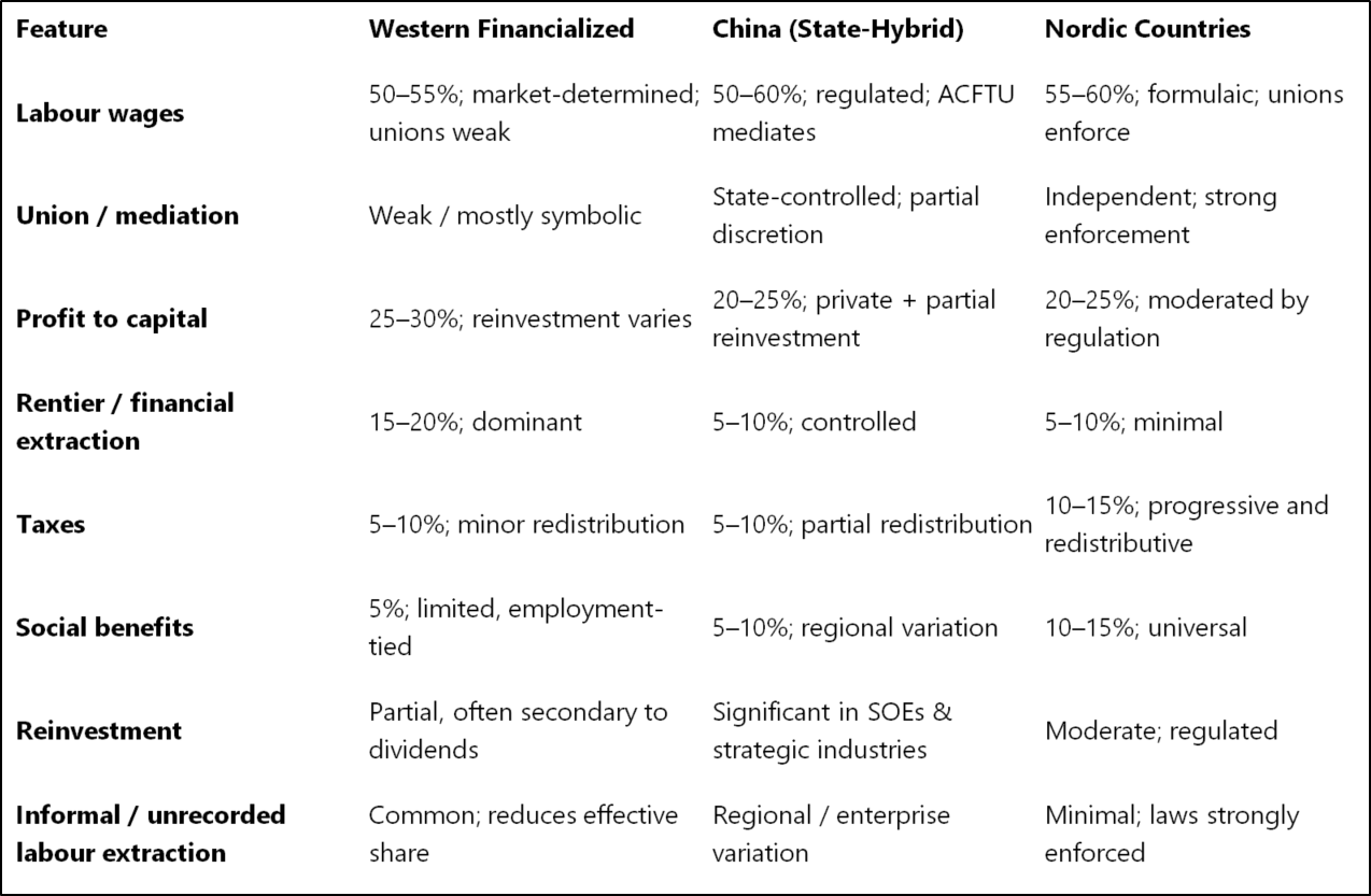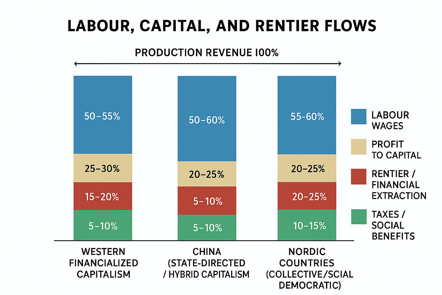Here’s a fully annotated, proportional-flow comparison of labour, capital, and value distribution across Western financialized capitalism, China, and Nordic countries. I’ve incorporated wages, profit, rentier/financial extraction, taxes, social benefits, enforcement mechanisms, and reinvestment. Percentages are illustrative to show relative magnitudes.