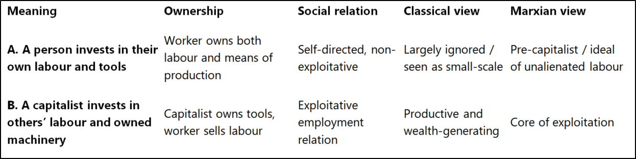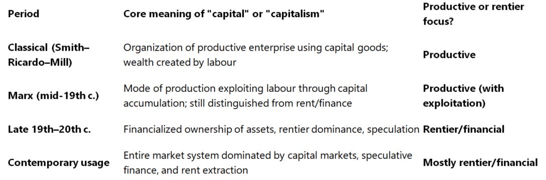 “Capitalism” in classical economic theory (roughly late 18th to mid-19th century) did not mean what it does today. The original meaning was far narrower, more productive in orientation, and largely excluded the rentier, speculative, and financialized forms that dominate modern capitalism.