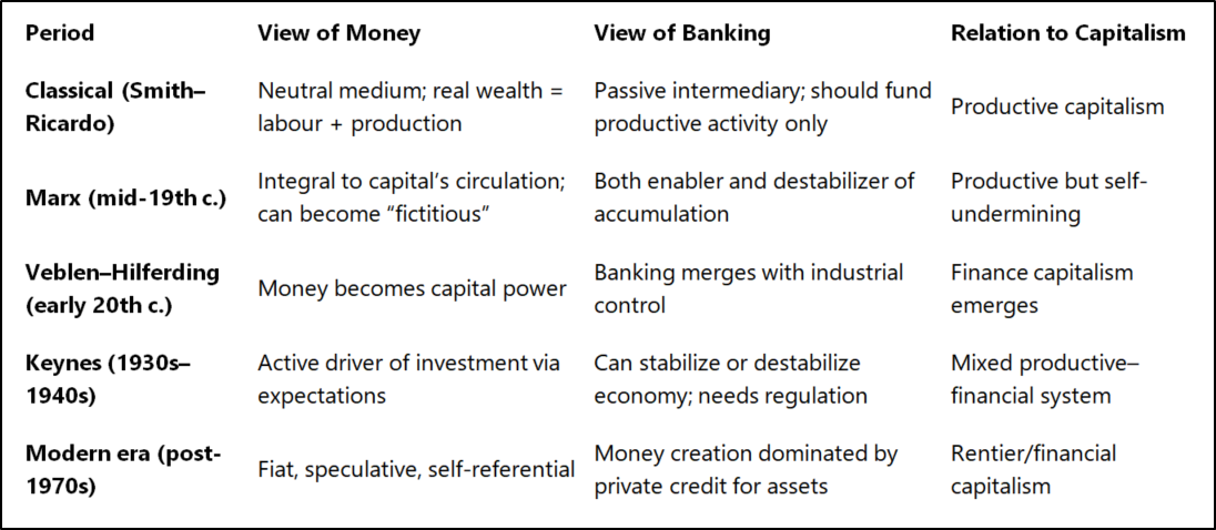 The understanding of banking and money was one of the key dividing lines between productive capitalism (as conceived by the classical economists) and the later financialized capitalism that supplanted it.