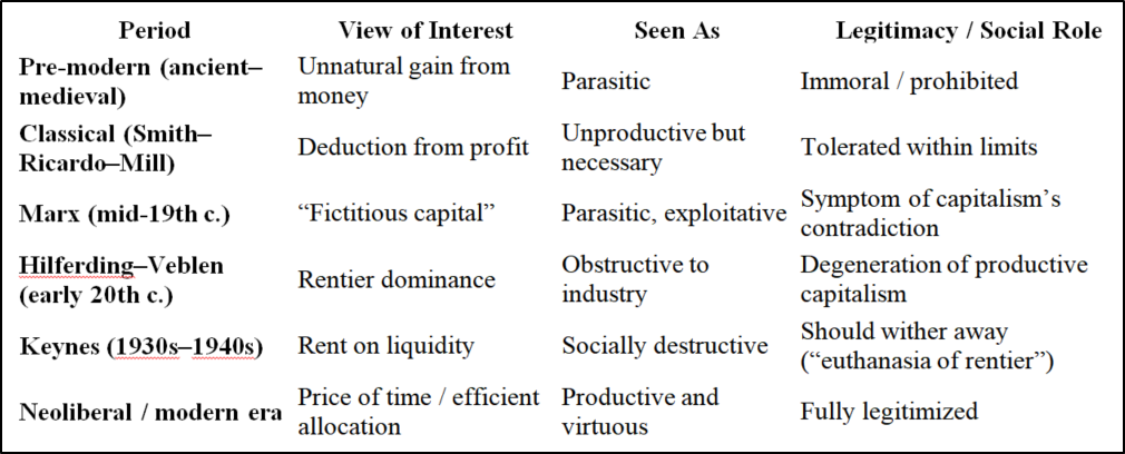 Interest is the missing piece that ties the whole evolution together. Its meaning and legitimacy shifted dramatically over time, tracking the broader change from productive capitalism to rentier-financial capitalism.