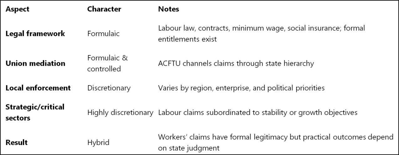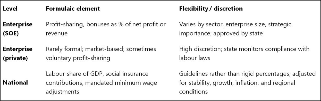 Notes: Labour claims mediated by state; SOEs closer to formulaic; rentier extraction limited; regional variation affects enforcement.