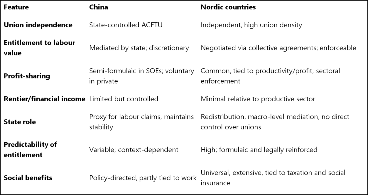 Notes: Labour entitlement formulaic, legally enforceable; redistribution ensures high effective share of value; rentier influence minimal; speculative finance small.