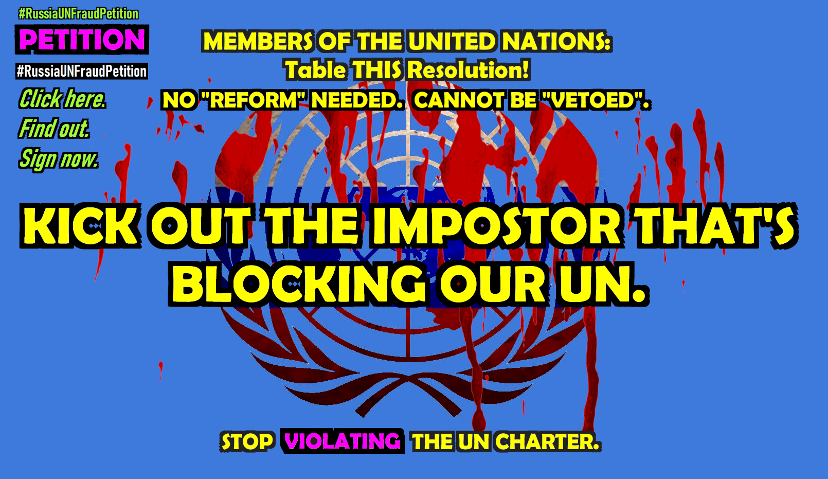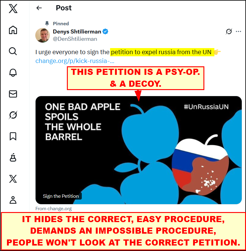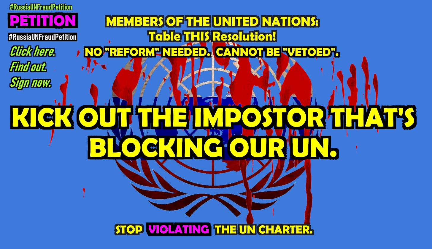 Millions of people have been PUT OFF by the “#KickRussiaOut”, #UnRussiaUN” PSY-OP petition and web site, demanding UNNECESSARY and IMPOSSIBLE action. Read the facts, the law, and the ONLY WAY to expel the Moscow impostors.
