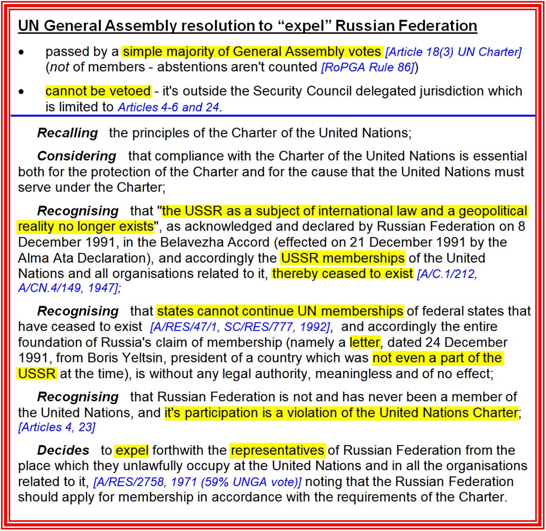 ·The video and documents proving Russia is not in the UN, and its representatives can be expelled by a simple majority (of members present and voting, abstentions aren’t counted) resolution of the UN General Assembly, within a week. No veto, no "reform".