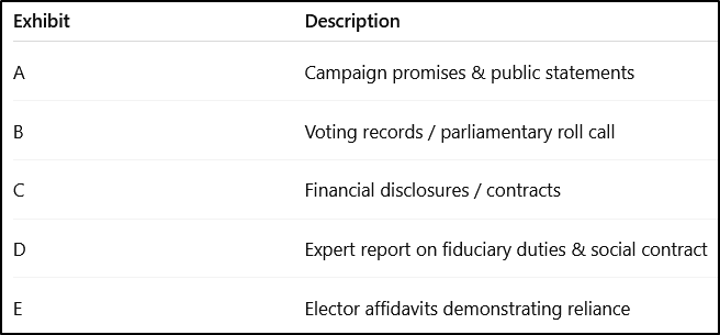 Here is a ready-to-use combined case bundle for a High Court test case on fiduciary-type duties of elected representatives in New Zealand. It integrates the Statement of Claim, Judicial Argument Brief, procedural timeline, exhibits framework, and model hearing submissions in a single structured format.