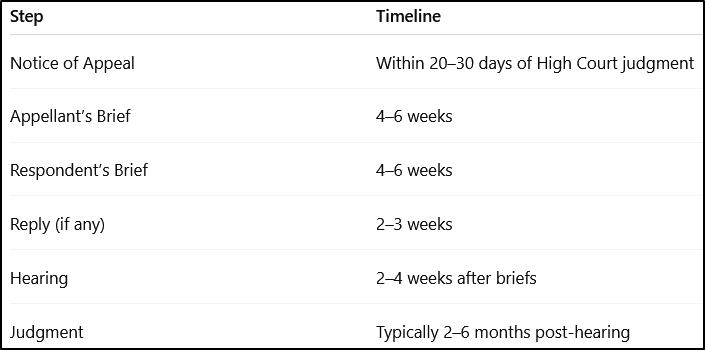 Case Prep → Filing & Service → Discovery → High Court Hearing → Judgment → Appeal (if necessary) → Enforcement