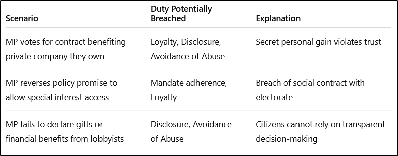 Duty of loyalty – act in electorate’s interest, not personal gain.
