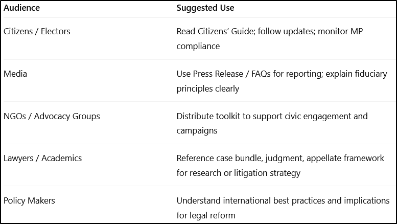 This toolkit is now a complete, professional advocacy package enabling citizens, media, lawyers, and NGOs to engage effectively with the issue of fiduciary-type duties for elected representatives in New Zealand.
