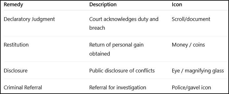 Remedies: declaratory judgment, restitution, disclosure, criminal referral