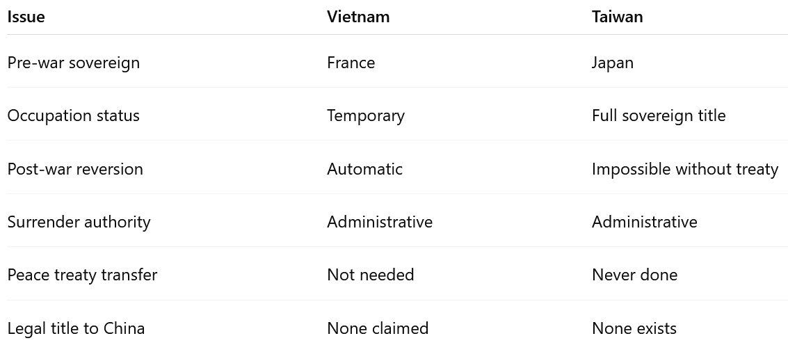So technically, Taiwan’s “return” to China is based on post-war declarations and administrative occupation, not a formal treaty ceding it to the ROC.