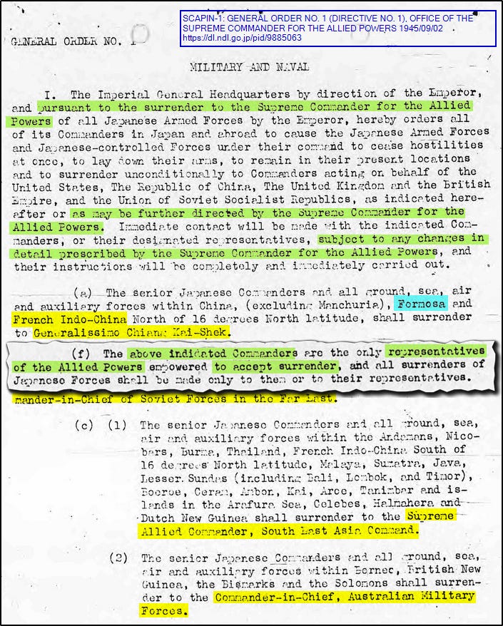 After Japan’s surrender, Taiwan came under the administration of Chiang Kai-Shek personally — not a country called the Republic of China (ROC) — by General Order No. 1 of the Allied command. The order stated he was a representative of the Allied Powers — to accept surrender, which continued as an administrative occupation.