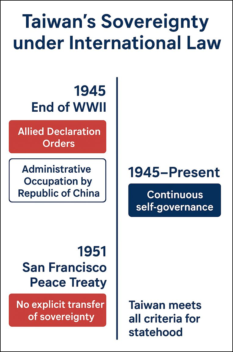 Consequently, in both fact and law, Taiwan functions as a sovereign entity, notwithstanding the absence of formal international treaty recognition.