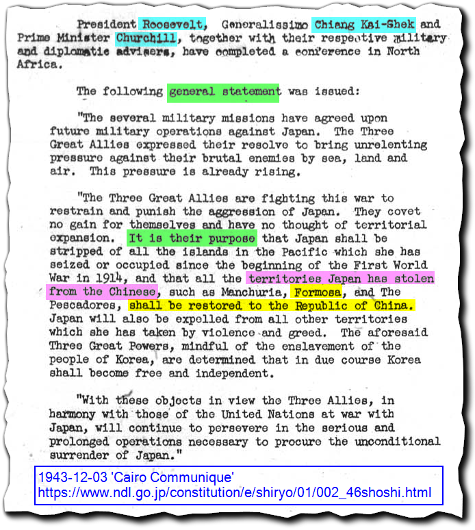 The Cairo Communique (1943) explicitly stated it was a “general statement … of purpose” by 3 of the states during the War, not a Treaty transferring ownership. It does not appear to have been signed. It is based on a mistake: unlike the many territories Japan “stole” since 1914 (such as Vietnam and Korea), “Formosa” (Taiwan) was ceded to Japan by China in a treaty in 1895, internationally noted and recognised.